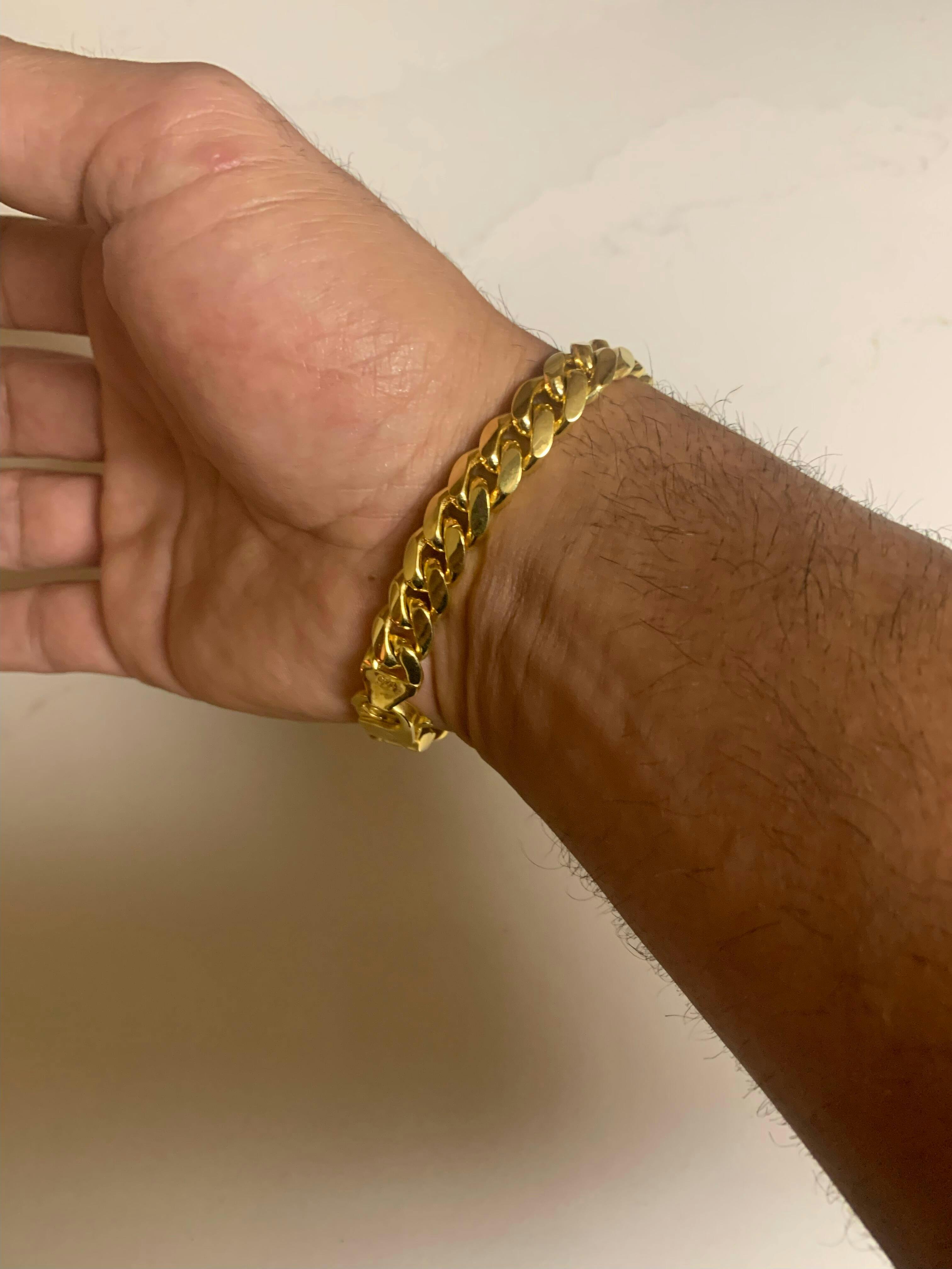 This 10mm Miami Cuban bracelet is for those who want their jewelry to speak loud and clear. With its thick, interlocking links and high-shine finish, it delivers a powerful look that still feels refined. Each chain is crafted using the finest precious metals—real 18K gold layered over a solid 925 silver core—giving you lasting durability with a luxury feel. Whether you're at the office, training hard, or heading out for the night, this chain is made to live with you. Wear it solo for maximum impact or pair it with other pieces for a bold, layered stack. No matter how you style it, this chain commands attention.