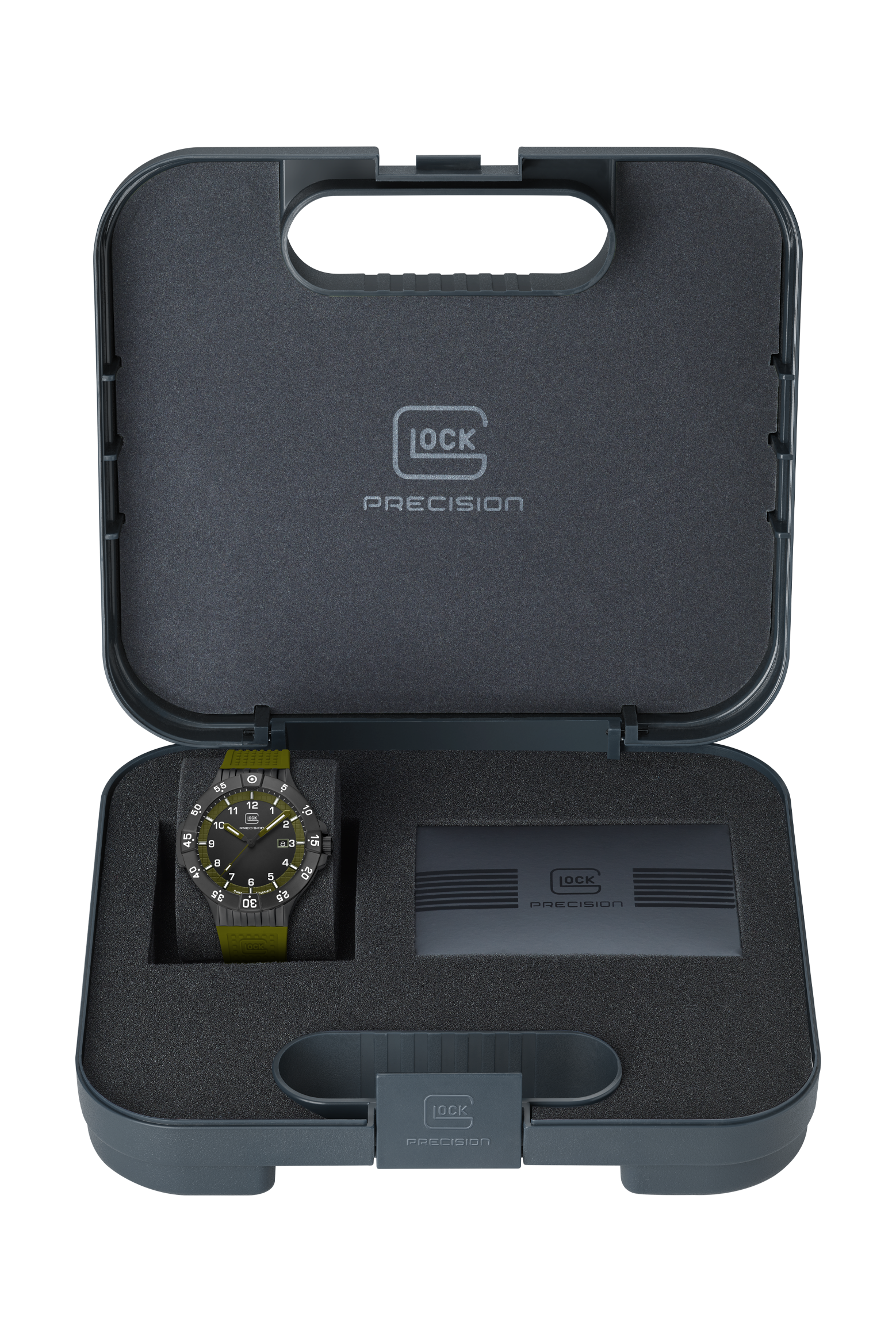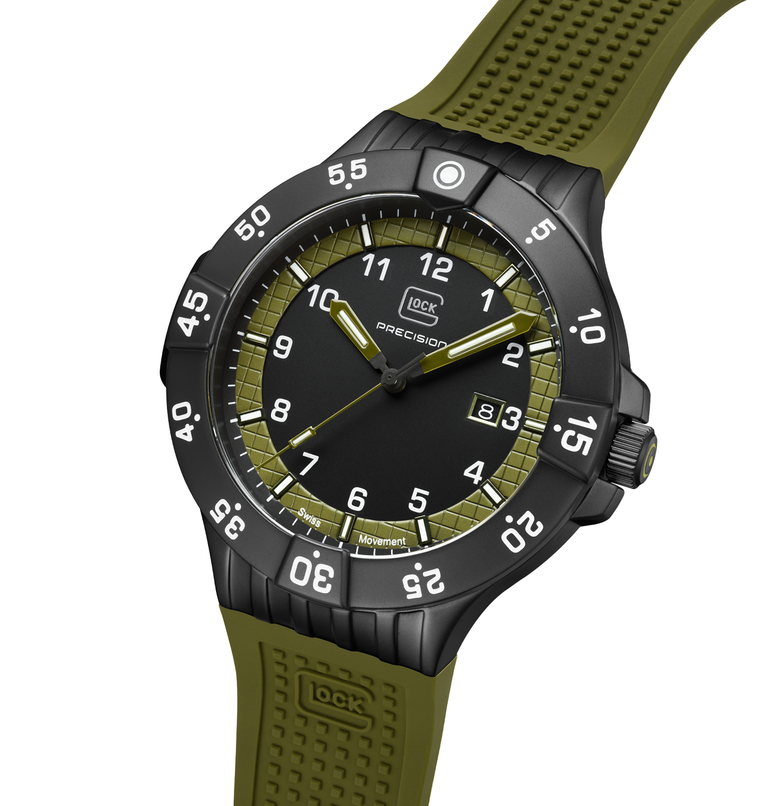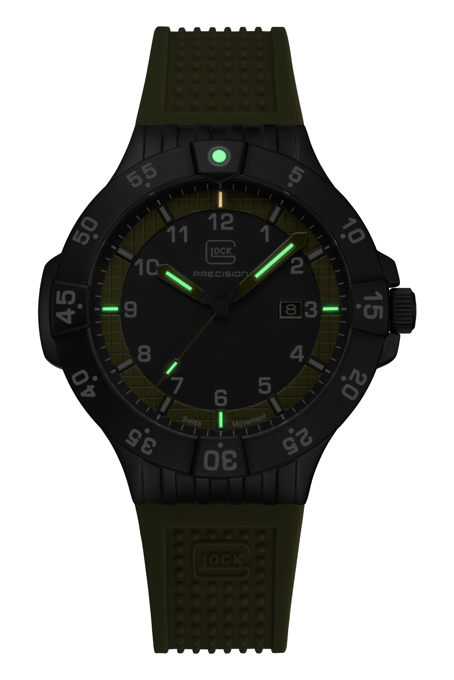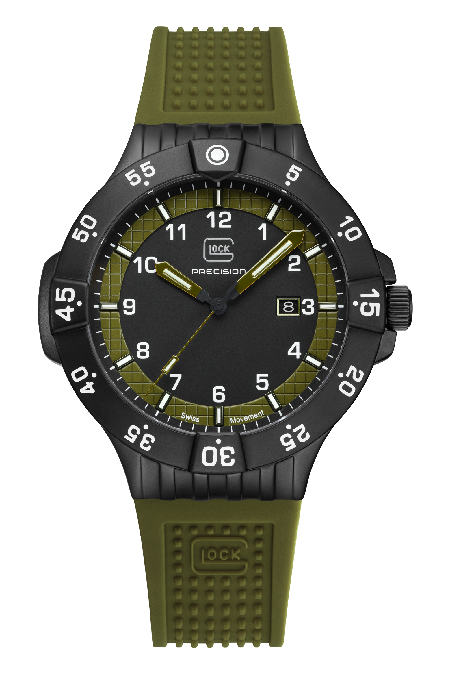 Encased in a gunmetal sandblasted stainless-steel housing, the black and army green dial features Tritium tubes by Trigalight® at the 3, 6, and 9-hour markers, as well as on the second, minute, and hour hands, ensuring constant illumination. The 12 o’clock position is highlighted by a vibrant orange Tritium tube for enhanced visibility in low-light conditions. A silicone strap with GLOCK's RTF texture encircles the wrist, creating an athletic look. Powered by a Swiss movement and rated to 10 ATM water resistance, this watch represents durability and resilience.