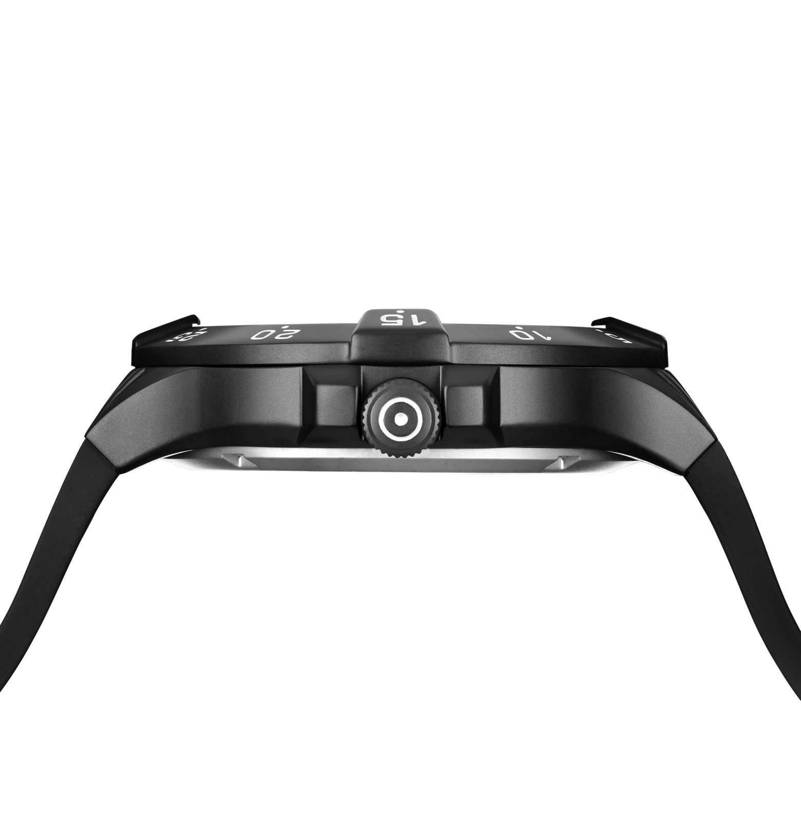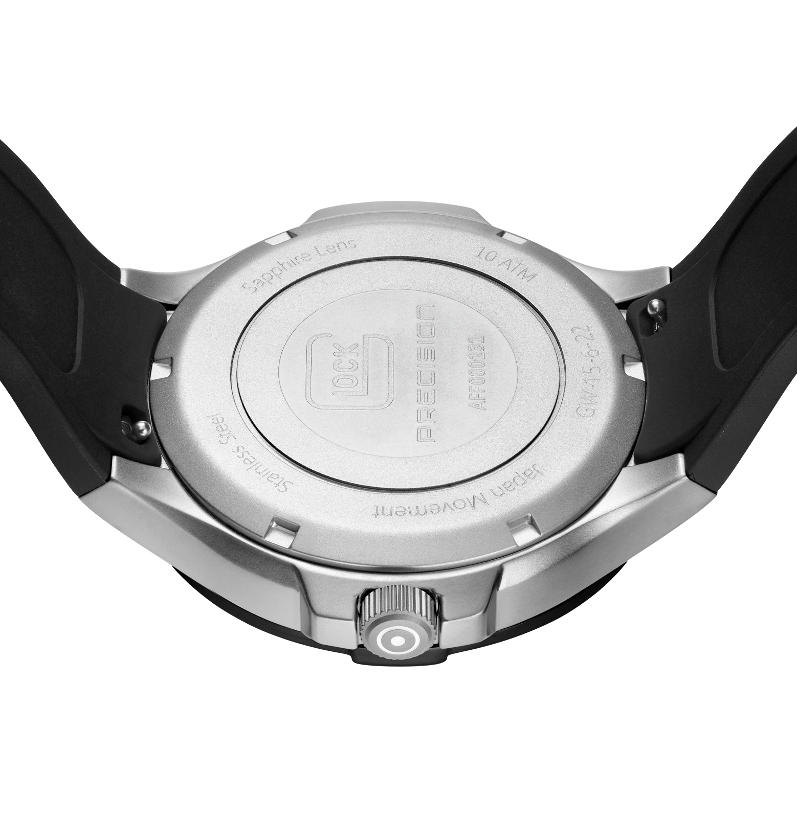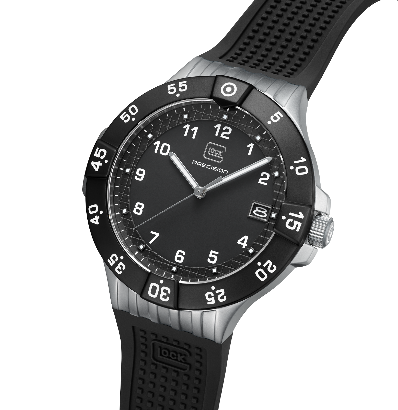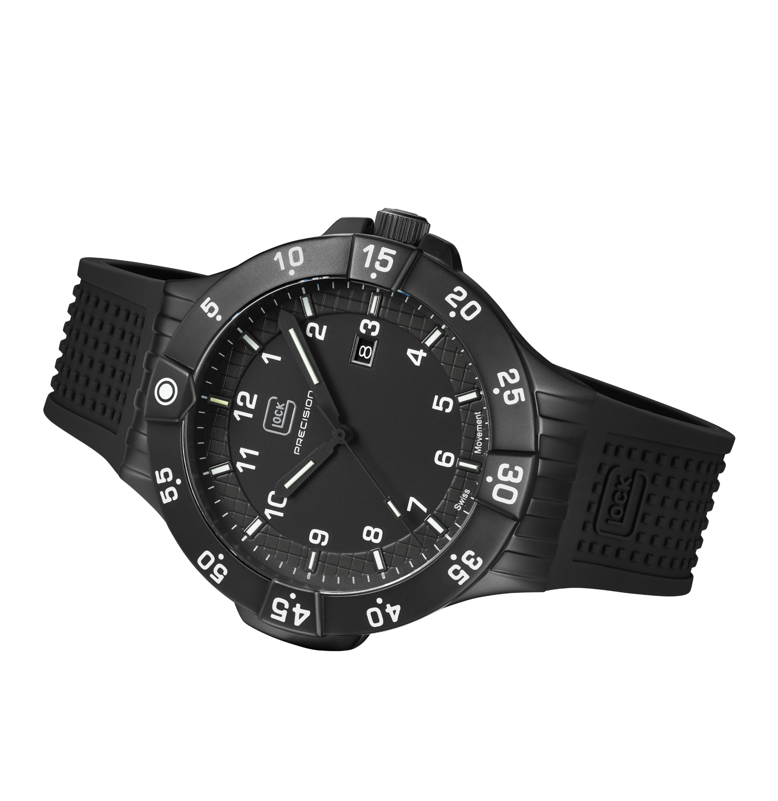 Encased in a gunmetal sandblasted stainless-steel housing, the black and army green dial features Tritium tubes by Trigalight® at the 3, 6, and 9-hour markers, as well as on the second, minute, and hour hands, ensuring constant illumination. The 12 o’clock position is highlighted by a vibrant orange Tritium tube for enhanced visibility in low-light conditions. A silicone strap with GLOCK's RTF texture encircles the wrist, creating an athletic look. Powered by a Swiss movement and rated to 10 ATM water resistance, this watch represents durability and resilience.