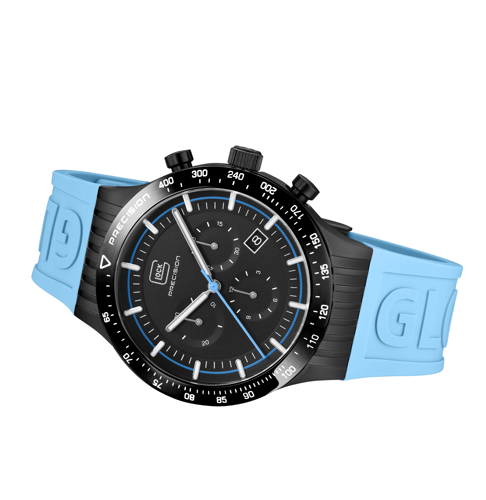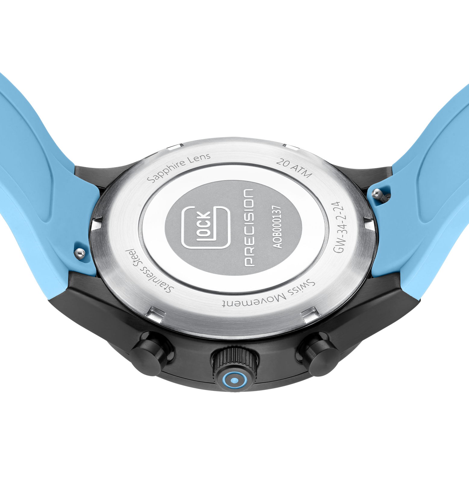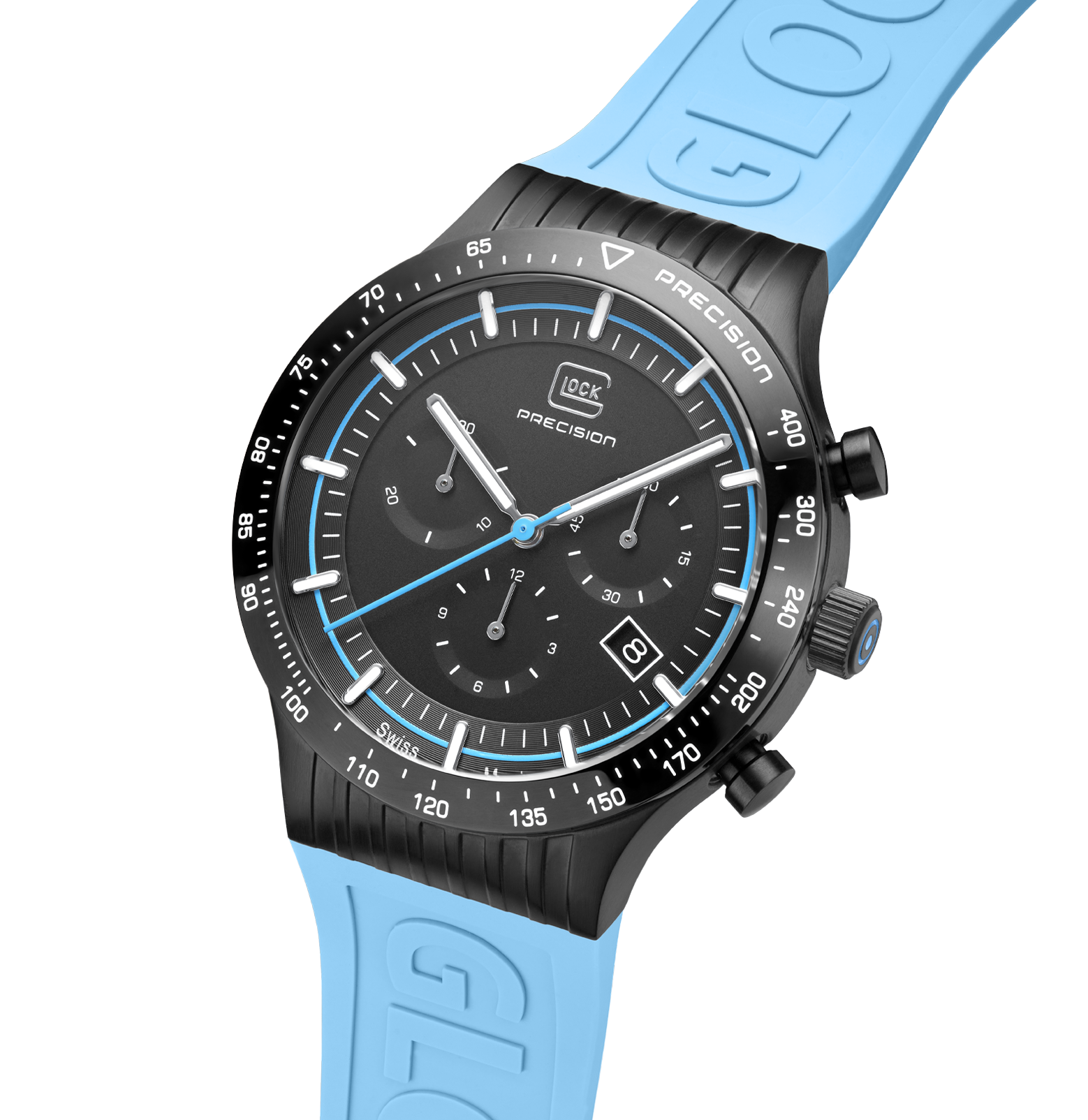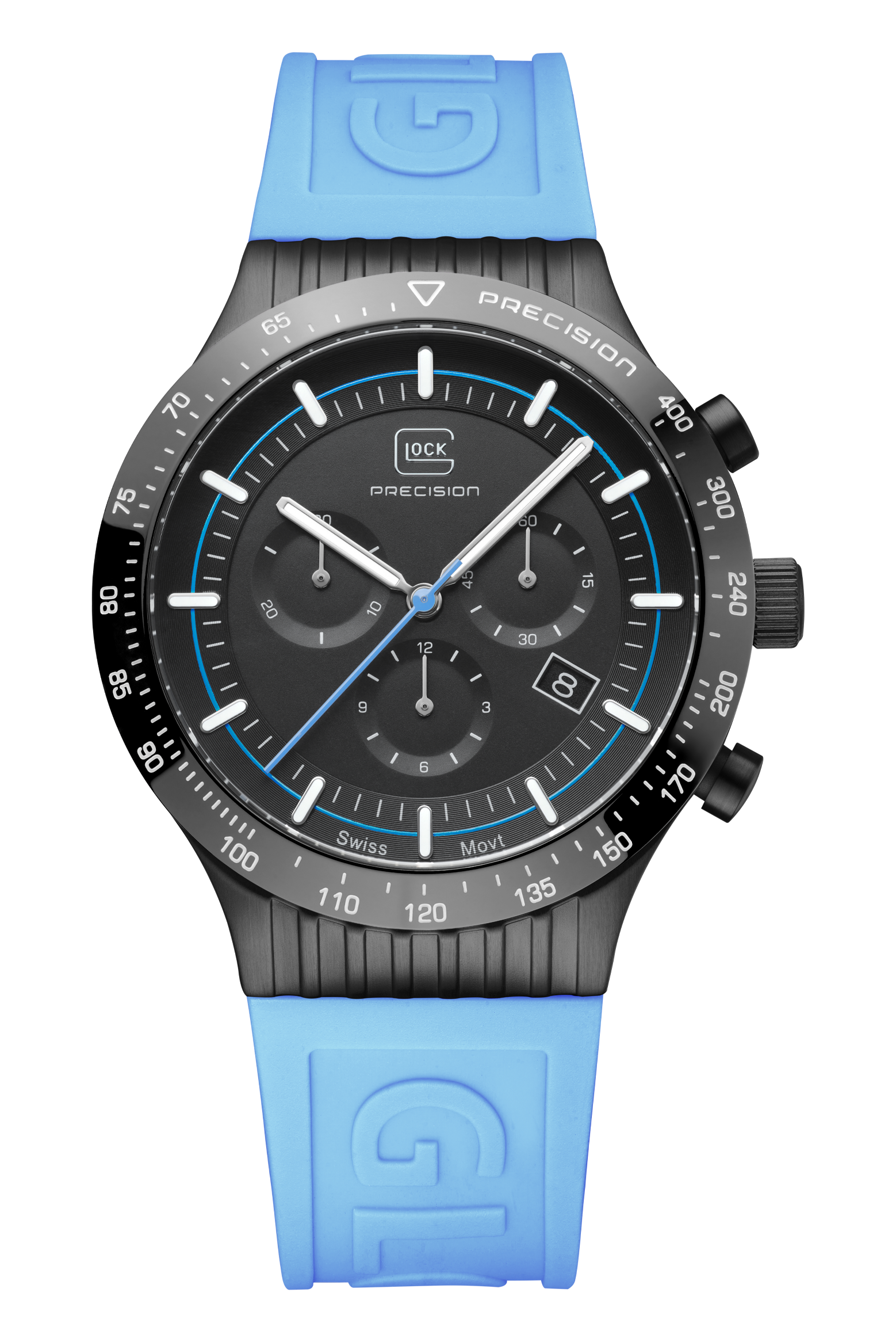Encased in stainless steel, this watch boasts a silicone strap with GLOCK lettering. Powered by a Swiss movement, it guarantees timekeeping accuracy. Enhanced by a chronograph function, hands and indices with Swiss Super-LumiNova®, and a 20 ATM water-resistance rating, it represents precision, reliability, and style.