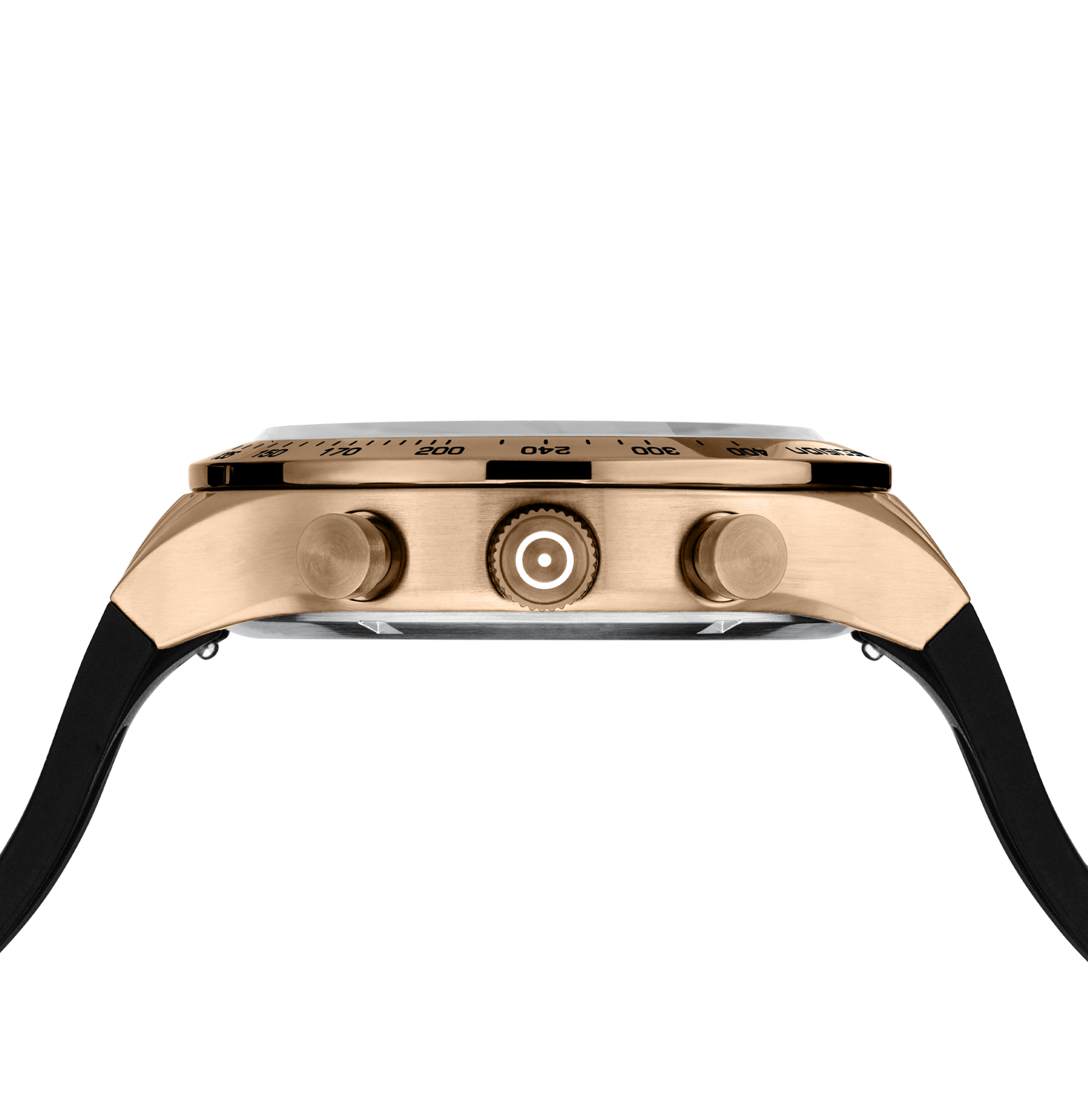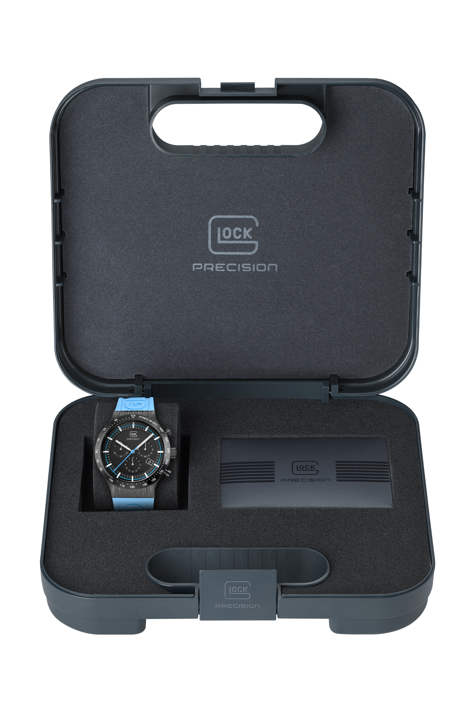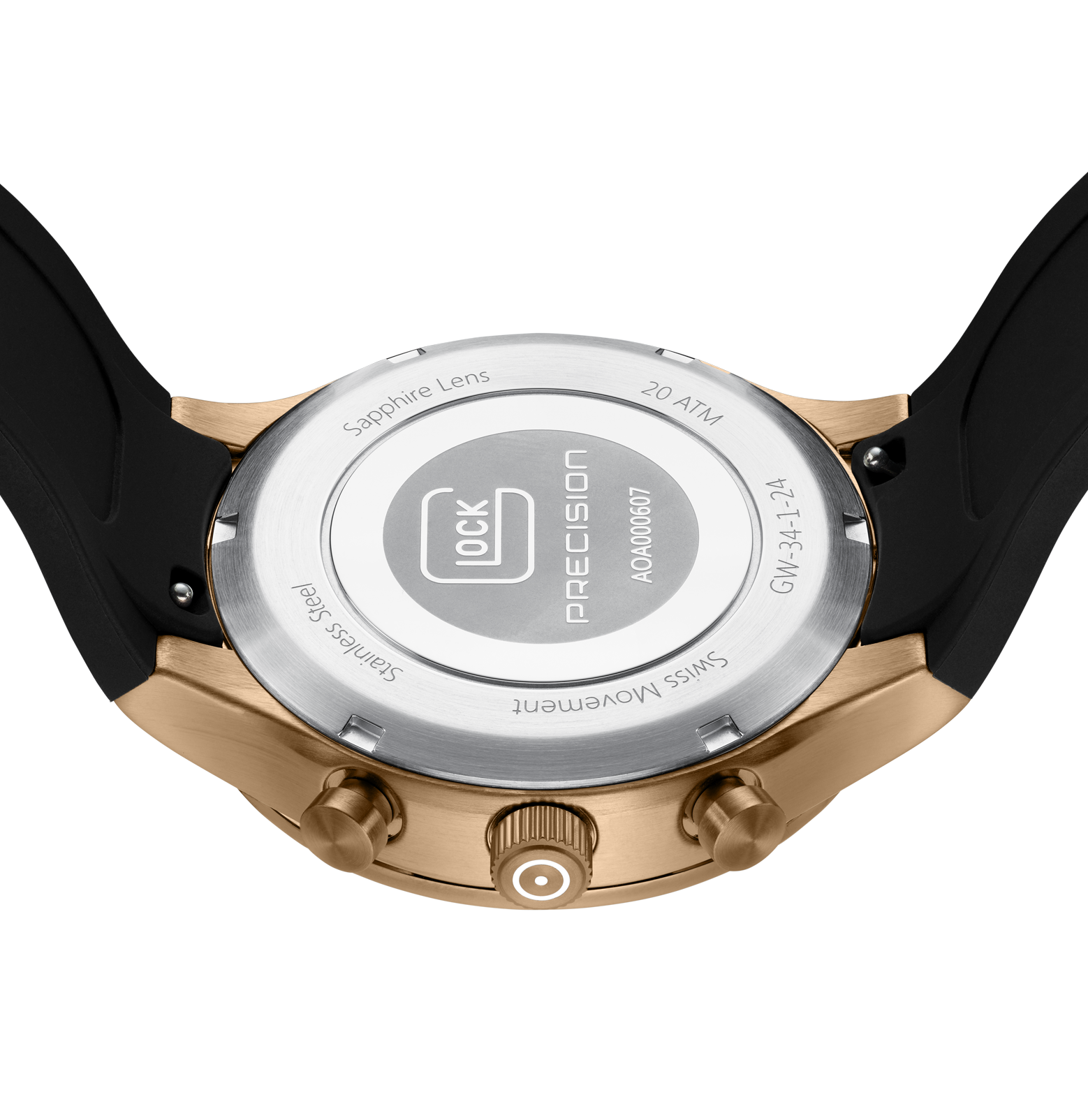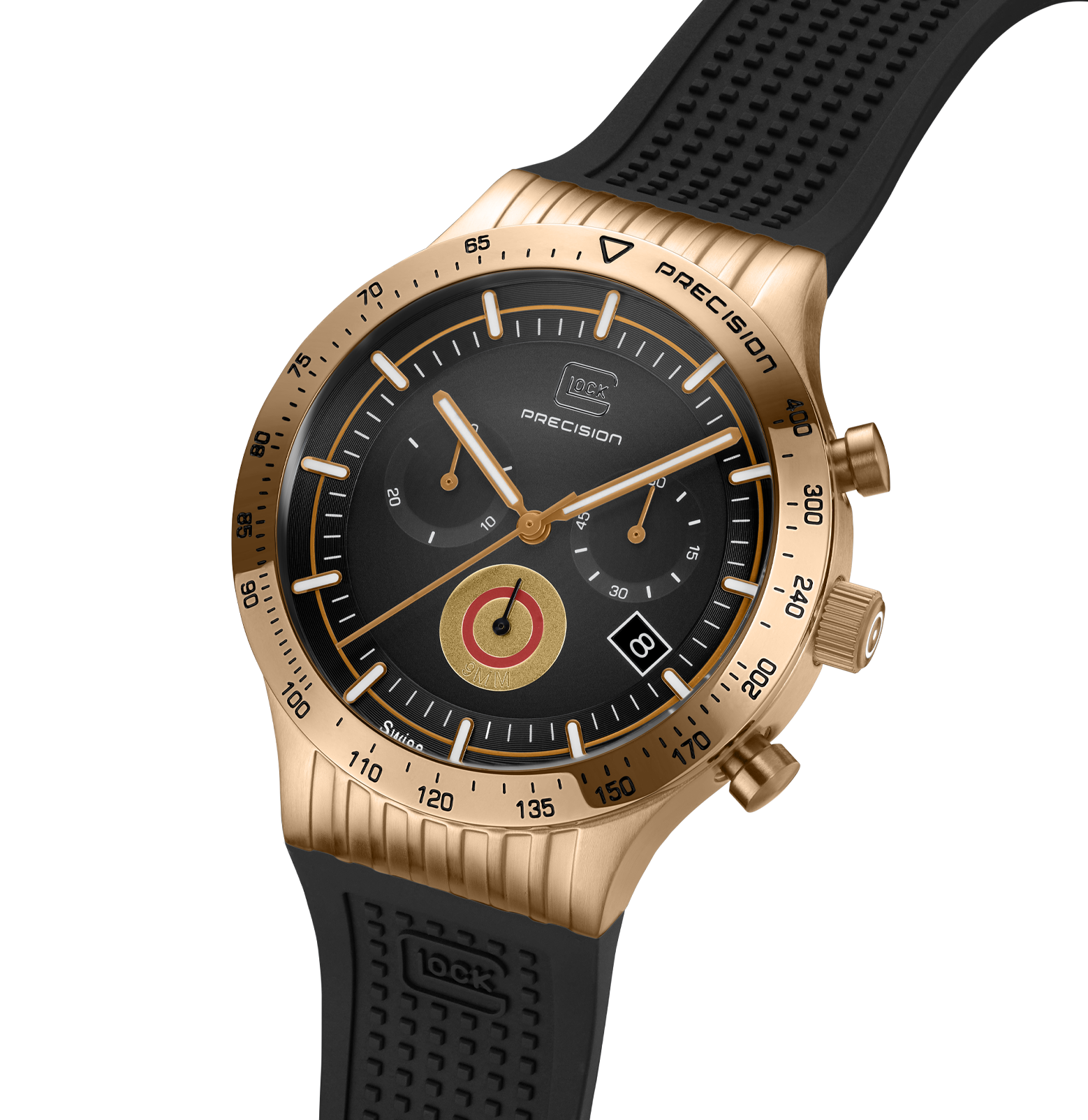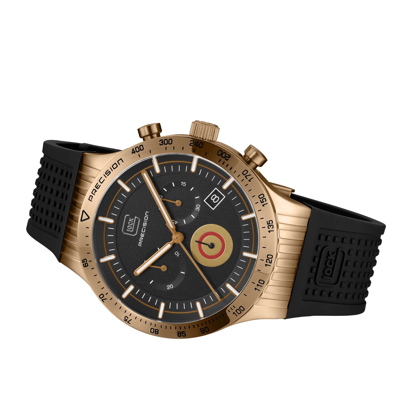 Encased in stainless steel, this watch boasts a silicone strap with GLOCK lettering. Powered by a Swiss movement, it guarantees timekeeping accuracy. Enhanced by a chronograph function, hands and indices with Swiss Super-LumiNova®, and a 20 ATM water-resistance rating, it represents precision, reliability, and style.