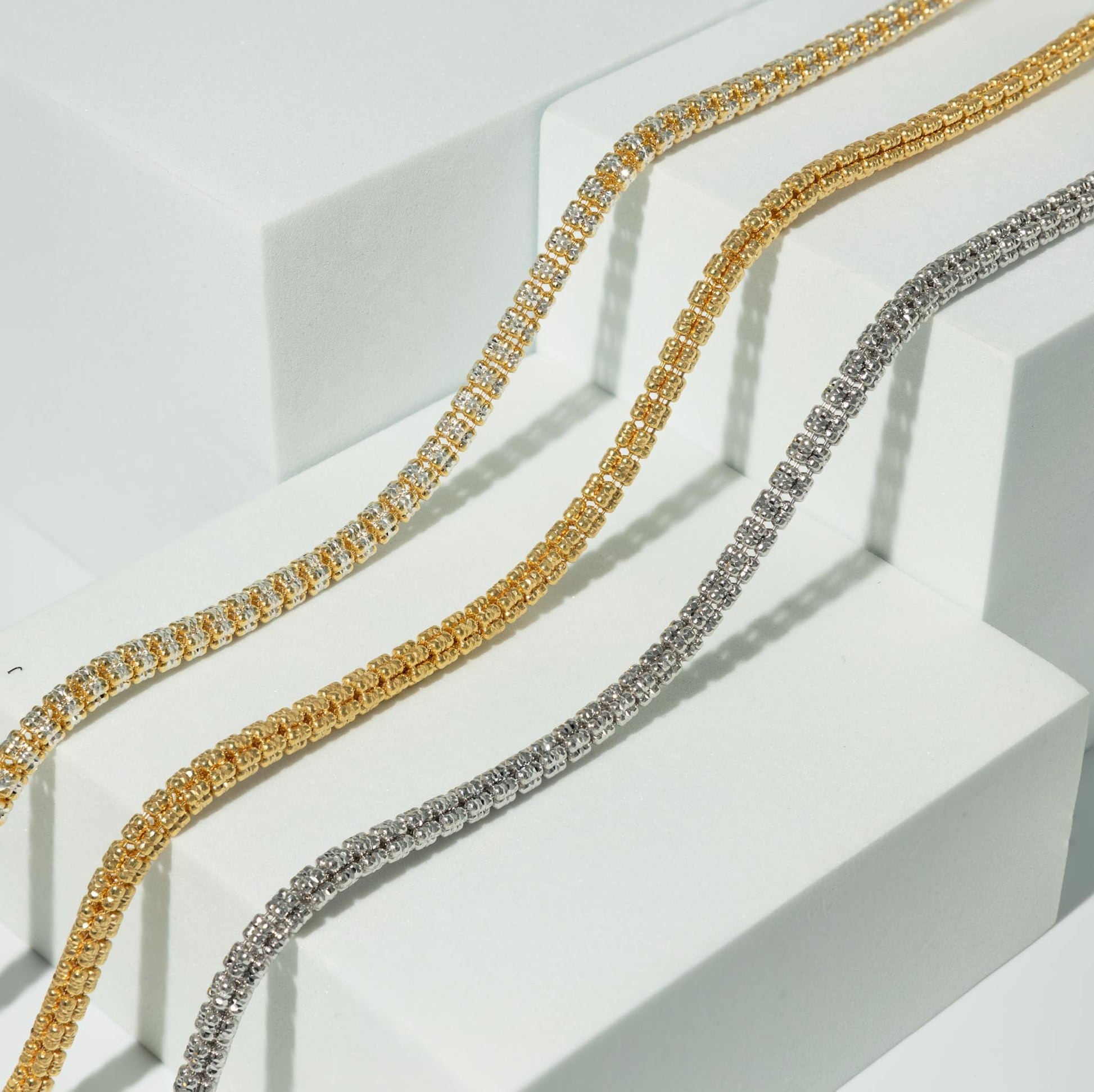 The Two-Tone Ice Chain brings serious shine—without a single stone. Featuring a diamond-cut finish that mimics the look of an iced-out chain, it delivers head-turning brilliance with a cleaner, sleeker feel. Crafted in Italy from solid 925 sterling silver and finished in real 18K gold, this chain is built for both style and durability. The rhodium coat adds a layer of protection to keep your chain looking fresh over time, while the custom clasp keeps it locked in all day. Whether you're keeping it minimal or going full stack, this chain hits with high-impact shine and zero fuss. Classic, clean, and built to shine on your terms.